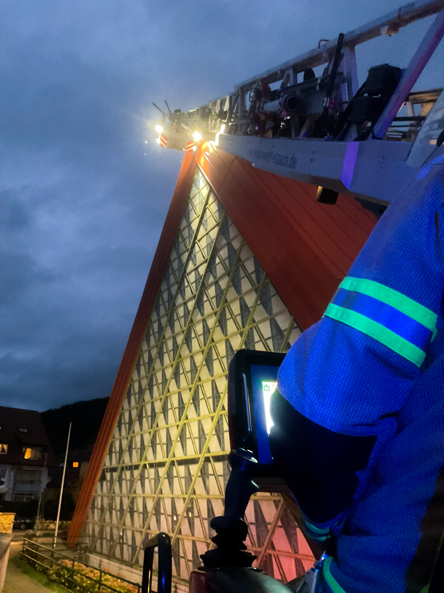 Die Feuerwehr Elzach, wurde zur Drehleiterunterstützung nach Bleibach alarmiert. Dort wurde an einem Gebäude ein Teil der Blechverkleidung durch den starken Wind verschoben, welches daraufhin abzustürzen drohte. Die Blechverkleidung wurde gesichert und die Einsatzstelle wurde übergeben. Da sich die Drehleiter der Feuerwehr Waldkirch zu dieser Zeit selbst im Einsatz befand, wurde die Drehleiter aus Elzach alarmiert.